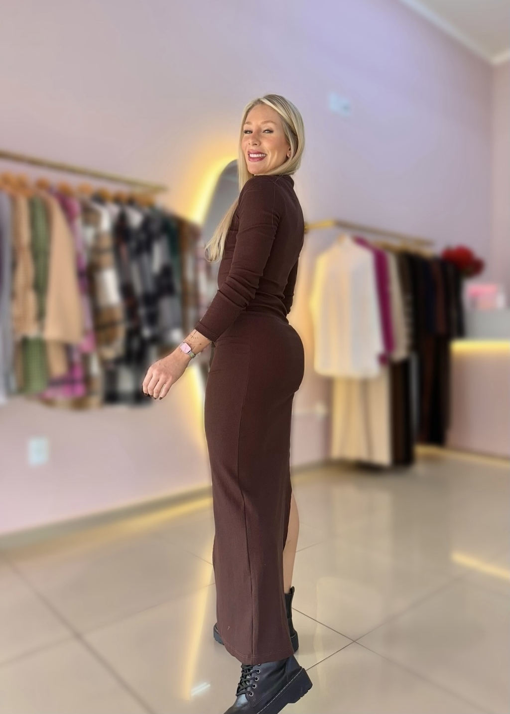 Características: vestido possui manga longa, gola alta e fenda regulável